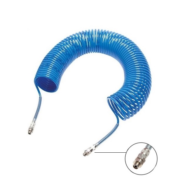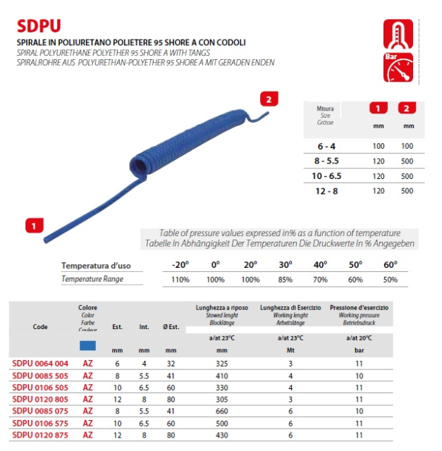 Polyuretanové kroucené hadice pro stlačený vzduch mají vlastnost smršťovat se do výchozí délky, tím po aplikaci nepřekáží na pracovišti v natažené délce. Hadice PU jsou otěruvzdorné a nelámají se, vynikající flexibilita.Vnějní průměr spirál: 4/6=32 mm, 5,5/8= 41 mm, 6,5/10=60 mm, 8/12=80 mm. Všechny parametry uvedené v tabulce jsou při +20°C. Vyšší teplota má za následek snížení provozního tlaku (60°C = 50% tlaku).