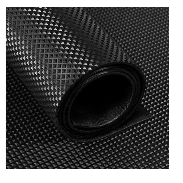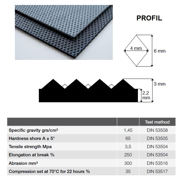Jednostranně rýhovaná pryžová podlahovina, tloušťka včetně dezénu 3 mm, šíře 1200 mm. vysoký reliéfní pyramidový design na jedné straně a jemná tkanina otiskový vzor na druhé straně.Volně položené aplikace na podlahy, chodníky, lišty, ložné plochy, pracovní stoly a plochy pro všeobecné použití.Obrušivost (odolnost vůči abrazi) dle DIN 53516 =300 mm3.Cena pryže je za 1 m2. Balení je pouze informativní, je možné odebrat jakékoliv množství.Při objednání do poznámky napište požadovaný rozměr.Nabízené služby: Strojní řezání pryže na pásky, řezání tvarového těsnění na digitálním plotru.