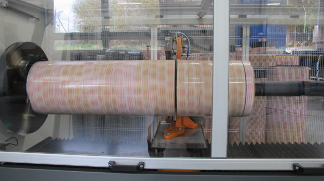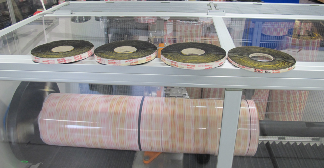 Stroj na řezání pásků profilů z expandované pryže. Řezání profilů je prováděno na nejmodernější technologii.