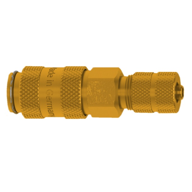 Spojky nejmenších rozměrů DN 2,7 z poniklované mosazi nebo nově z také z červené mosazi MS 58.Změna kódu u výrobce Lüdecke - nově pro niklované druhy ESMCN !Použití v oblasti pneumatice, v řídící, měřící a regulační technice.Na zažádání také k dispozici s červeným nebo modrým eloxovaným hliníkovým tělem spojky.