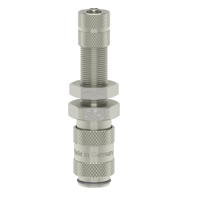 Spojky nejmenších rozměrů DN 2,7 z poniklované mosazi nebo nově z také z červené mosazi MS 58.Změna kódu u výrobce Lüdecke - nově pro niklované druhy ESMCN !Použití v oblasti pneumatice, v řídící, měřící a regulační technice.Na zažádání také k dispozici s červeným nebo modrým eloxovaným hliníkovým tělem spojky.