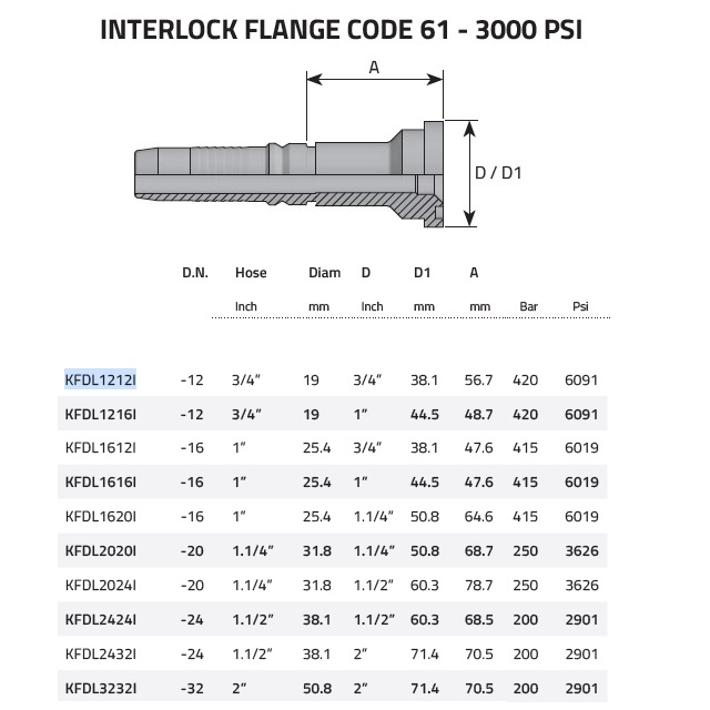 KFDL2024I; Celková délka (mm) L=167, Provozní tlak (bar) 210, Rozměr nátrubku (mm) SFL 1.1/2", DN (mm) 32, D.* (mm) 60,3, Hmotnost (kg) 0,759, Velikost [modul] (-20), Hadice d/D 1.1/4"