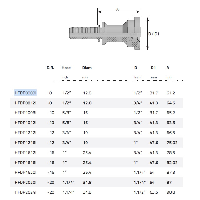 VariantyFDP0808I; Celková délka (mm) 83, Provozní tlak (bar) 415, Rozměr nátrubku (mm) SFS 1/2", DN (mm) 12, D.* (mm) D31,7, Hmotnost (kg) 0,21, Velikost [modul] (-08), Hadice d/D 1/2"