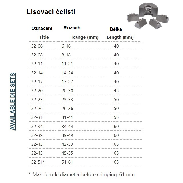 SM 32 ME - Hydraulický lis do maximální velikosti hadice 1.1/2" 1SN; 1.1/4" 2SN nebo 1" 4SP.Rozměr lisu 645x470x600 mm, 118 Kg. VERZE:ME - manuální verze je standardní stroj s mikrometrem.SE je vybaveno moderním a přesným digitálním ovládáním s volitelným nožním pedálem. Motor: 2,2 kW 400V 3-Ph, lisovací síla 1450 kN, manuální řízení.Motor lze objednat i pro síť 230 Voltů ve výkonu 1 nebo 3 PH (50 Hz), cena je o 1% vyšší, zde jsou výkony také 2,2 kW.Rozsah čelistí kompatibilní pro obě zařízení (nejsou součástí stroje): 6-16; 8-18; 11-21; 14-24; 17-27; 20-30; 23-33; 26-36; 31-41; 34-44; 39-49; 43-53; 45-55; 51-61 mm.