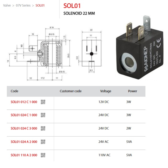Cívka ventilu pro ovládání válce. Průměr čepu solenoidu 8 mm. Krytí IP65 IEC 60529. Jako hlavní cívku výrobce doporučuje SOL01024C3000, kde parametry jsou nejuniverzálnější (výchozí typ) a šetří energii. Přípustná tolerance pro napětí je ±10%.Artikl 54058 nabízí všechny krytky těchto cívek (průměr 22 i 30-36 mm).