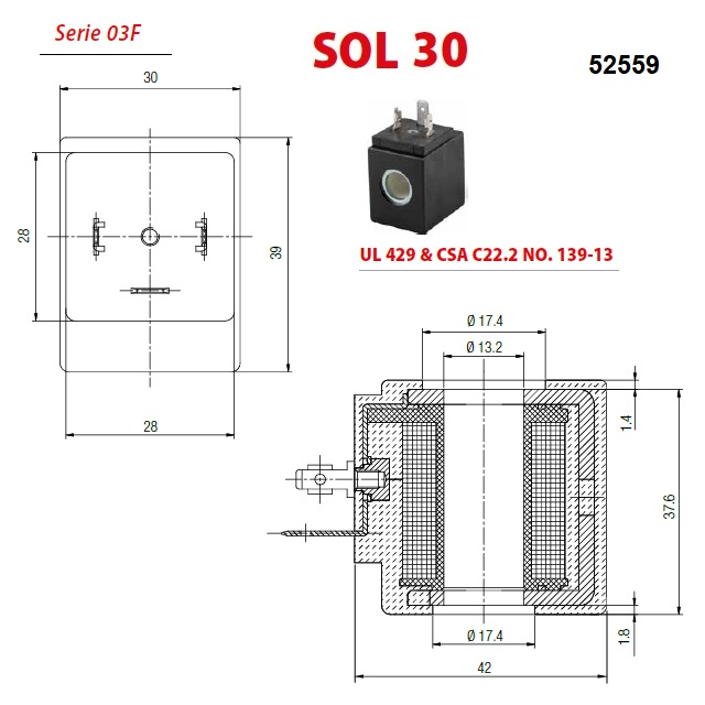 SOL20024AA000; Série 03F-série C, DN (mm) 30, D.* (mm) *D13, Napětí 24 AC/50-60Hz, Výkon 14 VA, Hmotnost (kg) 0,136