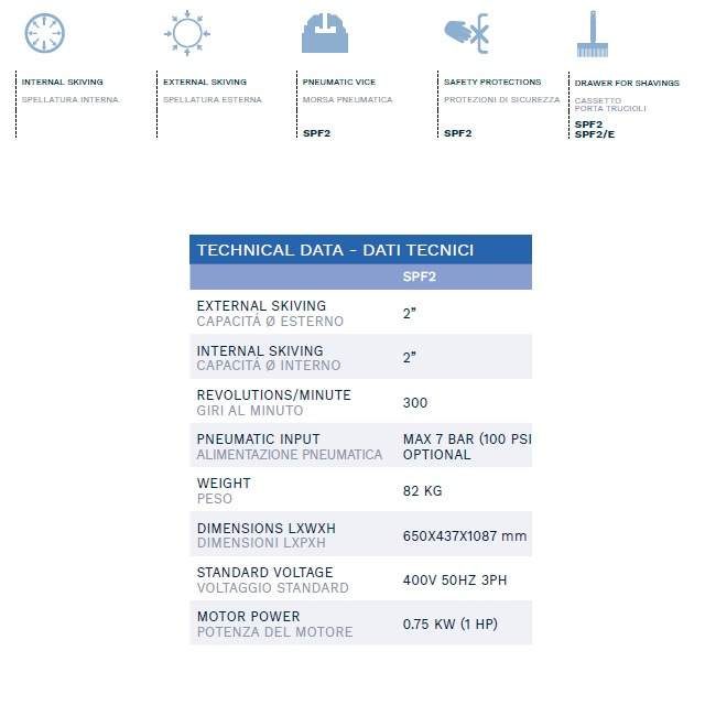 SPF2 je určen odstranění části vnitřní nebo vnější vrstvy hadice, aby byla připravena pro montáž koncovky.Tento typ stroje se používá ve výrobě hydraulických systémů, kde je potřeba odstranit část stěny hadice.Pneumatický svěrák umožňuje rychlé a bezpečné upnutí hadice během ořezávání.Pneumatické ovládání zajišťuje plynulý a efektivní provoz, s možností volby mezi elektrickým nebo pneumatickým pedálem.Otáčky: 300 ot./min.Napájení: 400V 50HZ 3PHRozměr: 640x437x1087 mm Ke stroji lze dokoupit vnitřní/vnější čepy(Artikl 54263) a držák čepů.