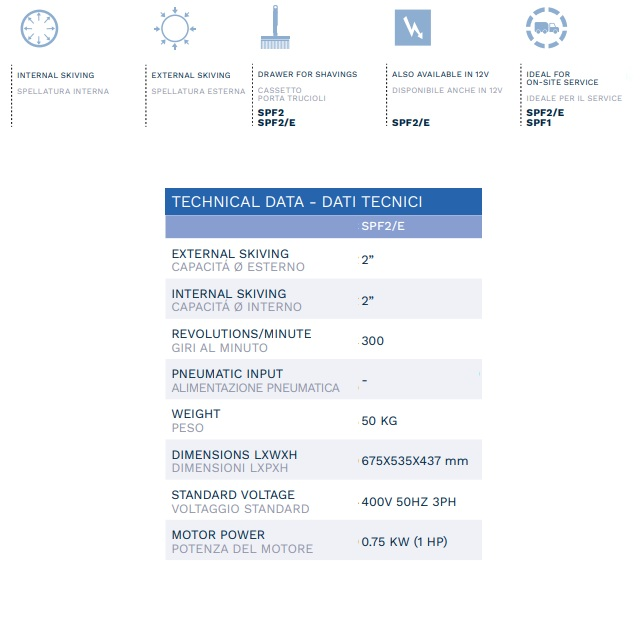 SPF2/E je určen odstranění části vnitřní nebo vnější vrstvy hadice, aby byla připravena pro montáž koncovky.SPF2/E je navržen jako menší, lehčí a snadněji ovladatelná varianta, která nabízí větší flexibilitu při použití.Tento typ stroje se používá ve výrobě hydraulických systémů, kde je potřeba odstranit část stěny hadice.Otáčky: 300 ot./min.Napájení: 400V 50HZ 3PHRozměr: 675x535x437 mm Ke stroji lze dokoupit vnitřní/vnější čepy(Artikl 54263) a držák čepů.