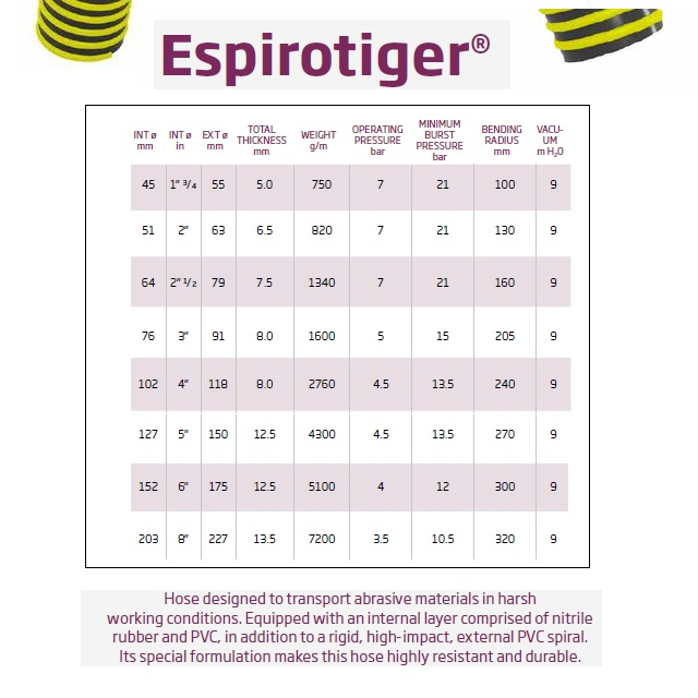 Hadice určená pro přepravu abrazivních materiálů jako zrna, jemný štěrk nebo cement v náročných pracovních podmínkách. Díky silné kontuře se používá k sání kalů a kašovitých hmot až do podtlaku 90 Kpa. Vybavena je vnitřní vrstvou složenou z nitrilové pryže, také s pevnou a silnější spirálou z tvzeného PVC. Díky speciálnímu složení je tato hadice vysoce odolná s velkou životností.Uvedené parametry v tabulce platí při teplotě 20°C.