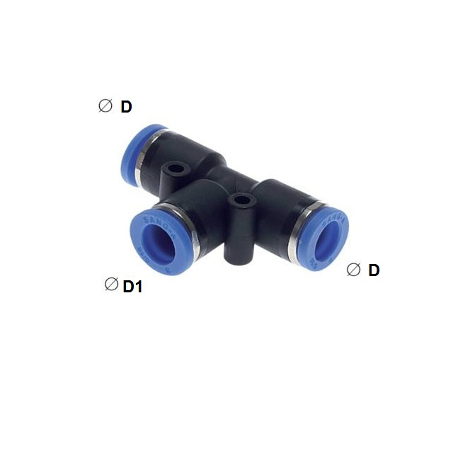 Jednoduchý systém spojování PA,PU a PE hadic pro automatizaci a rozvody vzduchu. * D-průběžná část spojky T - jedná se také o venkovní průměr D kalibrované hadice, která vstupuje do spojky Push-In.