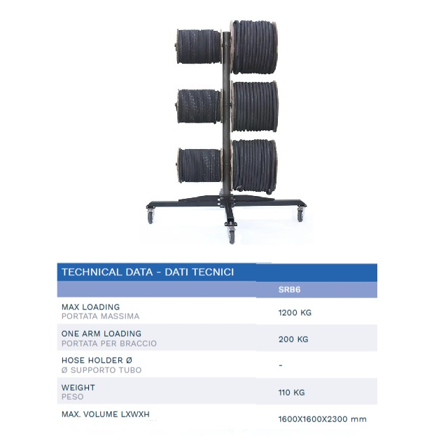 Držák hadice SRB6 je navržen tak, aby Vám pomohl zorganizovat práci a udržet vaši dílnu uklizenou. Verze SRB6 je opatřena šesti podpěrami, které usnadňují navíjení a odvíjení hydraulických hadic.Rozměry D x Š x V: 1600x1600x2300 mm.Dodací termín cca max. do 3 týdnů.