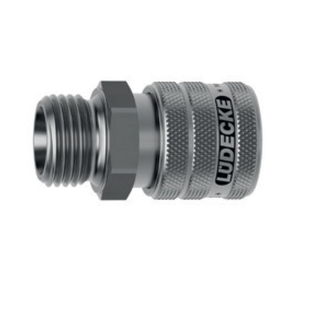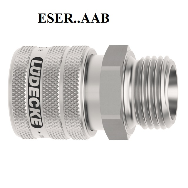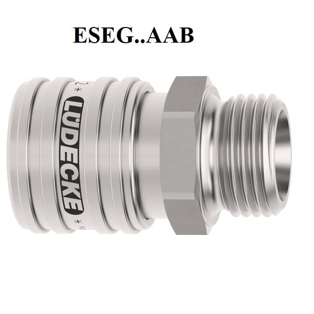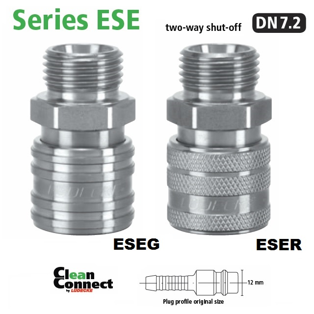 Rychlospojka z nerezové oceli 1.4305 s vnějším závitem, série Dn 7,2, oboustranně uzavíratelné. Rychlospojky mají průtok 660 l/min. i při nízkém tlaku a mají minimální odpor průtoku.Nerezové rychlospojky této série ESE DN 7,2 mají průměr nasazovacího čepu 12 mm.Několik oblastí použití, zejména pro kapalná média ve stavbě zařízení, měřící a regulační technologie, farmacie, lékařské technologie, chemický průmysl, potravinářský průmysl a také pro zvýšení čistoty a hygienických předpisů.Dvojité vypnutí, aby při odpojování nedošlo k úniku média. Spojky lze připojit pomocí přímých zástrček DN 7,2. Dvojité uzavírací zátky však nemohou být spojeno se standardními spojkami DN 7,2.Materiál: Těleso, objímka, tělo ventilu, ventil, kolíky, kuželka: nerezová ocel 1.4305. Pružiny, pojistný kroužek: nerezová ocel 1.4310, těsnění FKM (Viton).