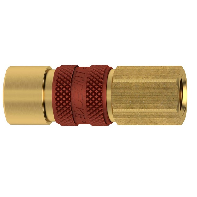 Rychlospojky DN 5 pro barevné a tvarové rozlišení spojek, které zamezuje spojit dvě různé koncovky mezi sebou, pokud nemají stejnou barvu.Určené pro stlačený vzduch v průmyslu a řemeslnictví; lze také použít pro vodu a jiné média.Převlečné, barevné, odpojovací objímky jsou z eloxovaného hliníku.Jednostranně uzavírací spojka, systému mini Série ESMK DN 5.Materiál: připojovací části, zabezpečovací prstenec, ventilové těleso, ventil MS 58.Pružiny, rozpěrný kroužek, koule z nerezového oceli 1.4310 a 1.3541, těsnění Perbunan.