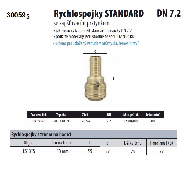 Univerzální rychlospojky Standard Dn 7,2 jsou určené pro stlačený vzduch, čep trnu je 12 mm. Rychlospojky mají jednostranné uzavření.Připojovací části, zajišťovací prstýnek a ventilové tělo jsou z mosazi MS 58.Pružiny, rozpěrný kroužek a kuličky jsou z nerezové oceli. Těsnění Perbunan (NBR).Rychlospojky Ludecke DN 7,2 jsou nejrozšířenějsí a jsou určeny nejen pro stlačený vzduch (1100 l/min.).Určeno pro stlačený vzduch v průmyslu, řemeslnictví, rovněž možno použít pneumatické nářadí s vysokou spotřebou stlačeného vzduchu.