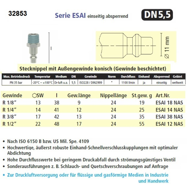 VariantyESAI18NAS; Celková délka (mm) L=38, Provozní tlak (bar) 35, Vnitřní závit R 1/8", DN (mm) 5,5, Délka závitu (mm) 9, Ventil ne, Hmotnost (kg) 0,019, Velikost [modul] ne, Šestihran 13