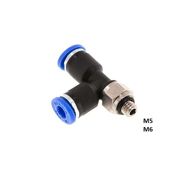 Závity PT (Pipe Thread) jsou trubkové (kuželové), některé v tabulce jsou i Metrické (M5, M6). Úhlové připojení T je otočné, rychloupínání do hadic venkovních průměrů *D, uvádí tabulka.