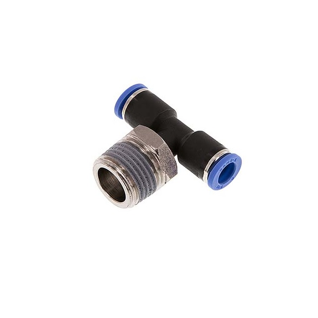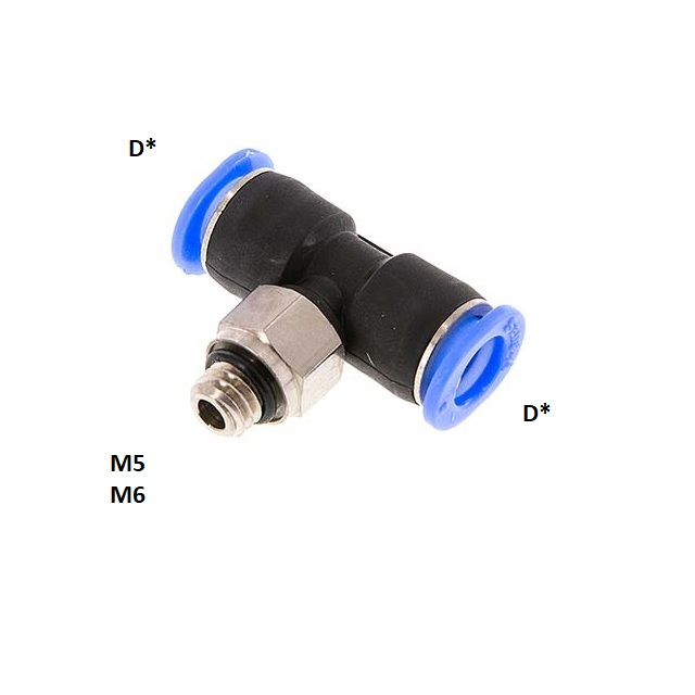 Připojovací trubkový závit R (PT), nástřik PTFE, u Metrických závitů je opatřen o-kroužkem. Úhlové připojení T je otočné. Výška je kóta od konce závitu k vnějšímu bodu v průběžné části pro hadice. *D= vnější průměr kalibrovaných hadic.