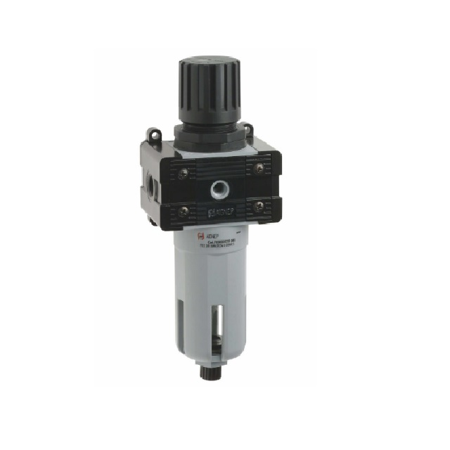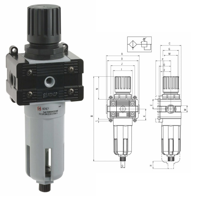 FR 1 - filtrace 5, 20 a 50 mikrónů, při průtoku vzduchu 1650 NI/min.FR 2 - filtrace 5, 20 a 50 mikrónů, při průtoku vzduchu 3000 NI/min.FR 3 - filtrace 5, 20 a 50 mikrónů, při průtoku vzduchu 4500 NI/min.Rozsah tlaků 0,5-2, 0,5-4, 0,5-8 nebo 0,5-12 barů.Výrobce Aignep všechny regulátory zkouší na tlak, a proto pokud regulátor propouští, byl namontován obráceně ve směru toku!Menší tlaky regulátor neotevřou. Ovládání S/M = poloautomatické a manuální, A = Aut. = automatické.Poloautomatické ovládání: musíte stisknout tlačítko a uvolnit ho, když je mísa plná.Automatické ovládání: Je připojena hadice na výstup ve spodní části, aby kondenzát byl automaticky odveden bez obsluhy. Z čela je regulátor vybaven G 1/8 pro tlakoměr (manometr), z levého boku je přívod tlaku pro regulaci.