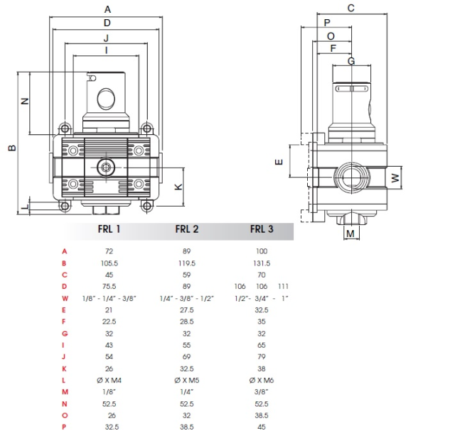 VariantyT050103000010; Provozní tlak (bar) 0-10, Vnitřní závit G 1/4", Šířka (mm) 72, Hmotnost (kg) 0,583, Velikost [modul] FRL1, Ovládání Manuální, Kóta B 105,5