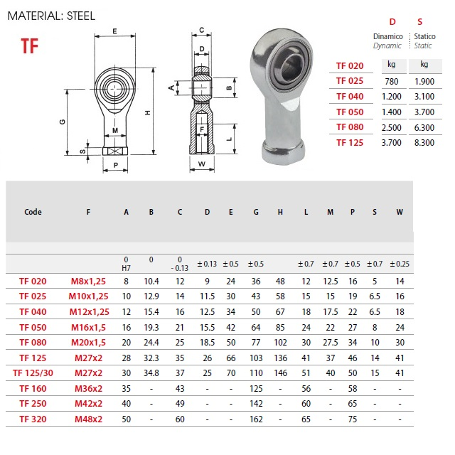 Kloubová, samomazná hlavice pro pneumatické válce výrobce AIGNEP.Příklad pro dynamické/statické zatížení přes ložisko pro:TF 12: 470/1100 Kg, TF 20: 780/1900 Kg, TF 25: 1200/3100 Kg, TF 40: 1400/3700 KgTF 50: 2500/6300 Kg, TF 80: 3700/8300 Kg, TF 125: 7100/10800 Kg.