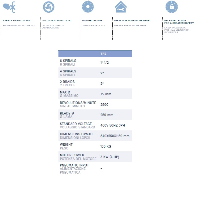 Řezačka pro dílenské prostředí či menší výrobní linky, kde je potřeba spolehlivé a bezpečné řešení pro řezání hadic.Stroj je vybaven nožním pedálem pro snadné ovládání, ochrannými kryty a zapuštěnou řezací hlavou, které zajišťují maximální bezpečnost obsluhy při práci.Řezání 1 až 4 spirálových hydraulických hadic do vnějšího průměru DN 50 (2″). U modelu se 6 spirálami dokáže řezat až do DN 38 (1.1/2″).Maximální průměr hadice je 75 mm.Motor: 3kW 400V, 50 Hz, 3PH. Rozměry: 840 x 550 x 1150, hmotnost 130 kgKe stroji lze doobjednat držák hadic.