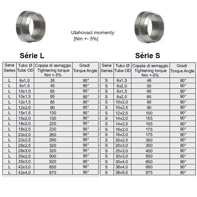 Komponenty : Těleso (trubka), zářezný kroužek, převlečná matice a proti hrdlo pokud jsou smontovány v souladu se správným postupem a podle specifikací výrobce, zajišťují utěsněný spoj.Při utahování matice se řezný kroužek zatlačí do 24° kužele spojky.V důsledku tohoto stlačení se kužel uvnitř kroužku roztáhne a trubka je hladce uzavřena zuby, což zaručuje hermetické utěsnění.Pro hydraulické řady - (L) lehká, (S) těžká (v malých průměrech jsou L+S rozměry prstenů stejné (proto LS).