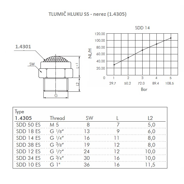 VariantySDD50ES-183; Provozní tlak (bar) 15, Série SS, Vnější závit M5x0,8, Hmotnost (kg) 0,002, Šestihran SW8, Poznámka Drátěná výplň 1.4301