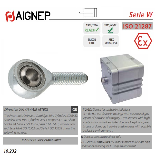 Kloubová, samomazná hlavice pro pneumatické kompaktní válce Série W výrobce AIGNEP. Zatížení uvádíme v odlišení, kdy převod této veličiny je ve zlomku dynamické/statické (v Kg).