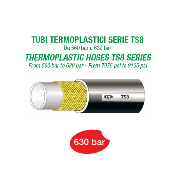 Vnitřní jádro z termoplastického polyesteru, výztuž z opletení z aramidového vlákna, vnější krytí v antireflexním polyuretanu, mikroperforovaná verze na vyžádání pro vedení vzduchu a kompatibilních plynů.Mikro-hadice řady TS8 byly vytvořeny pro velmi vysokotlaké hydraulické použití.