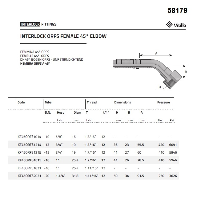 VariantyKF45ORFS1214; Provozní tlak (bar) 420, Vnitřní závit UNF1.3/16", Série S, DN (mm) 19, Hmotnost (kg) 0,269, Velikost [modul] (-12), Šestihran 36, Kóta B 23, Hadice d/D 3/4"