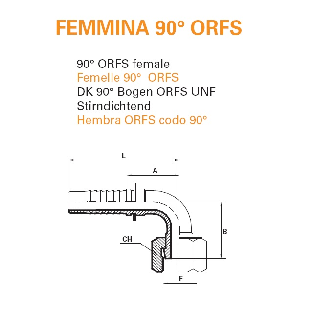 Lisovací nátrubek úhel 90° pro hydraulické hadice, americký závit UN(F), ORF.Dosedací plocha na tupo, těsnění není součástí výrobku.Pro výběr koncovky k patřičnému průměru hadice slouží údaj "Určeno na hadici [Inch]".