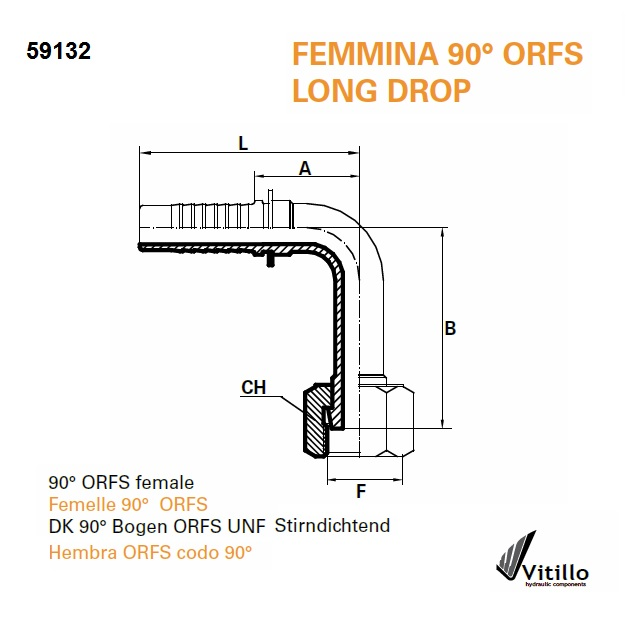 F90ORFS0811LD; Provozní tlak (bar) 415, Vnitřní závit 13/16"-16, DN (mm) 12, Hmotnost (kg) 0,113, Velikost [modul] (-08), Šestihran 24, Kóta B 63,5, Hadice d/D 1/2"