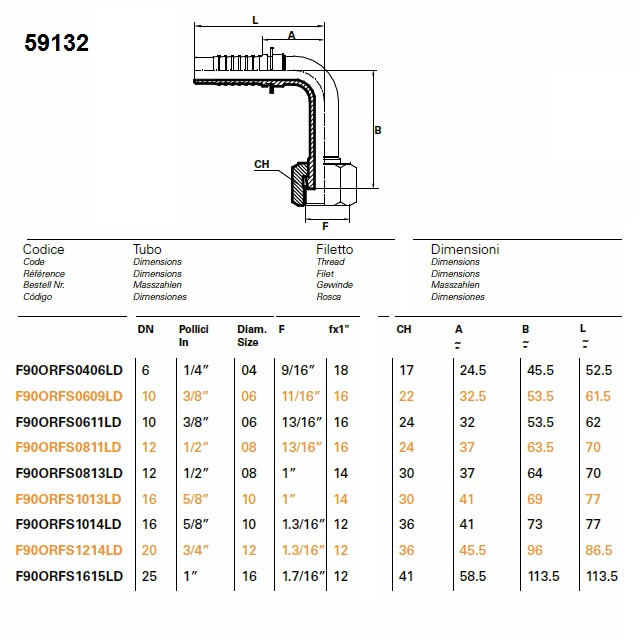 F90ORFS0406LD; Provozní tlak (bar) 450, Vnitřní závit 9/16"-18, DN (mm) 6, Hmotnost (kg) 0,039, Velikost [modul] (-04), Šestihran 17, Kóta B 45,5, Hadice d/D 1/2"