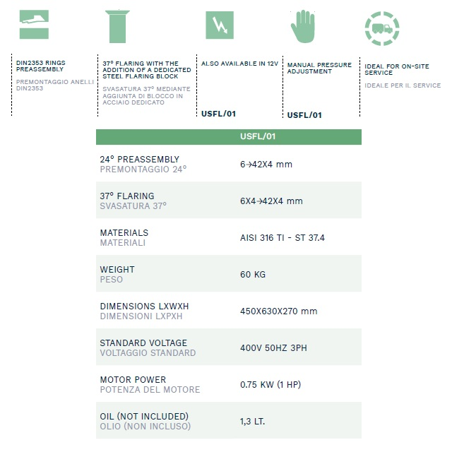 UNISPEED USFL/01 se používá při výrobě nebo opravách hydraulických trubek, které přenášejí olej pod vysokým tlakem, třeba v bagrech, lisech, zemědělských strojích nebo průmyslových systémech.Předmontáž prstenců dle normy DIN 2353 o průměrech od 6 mm do 42 mm s maximální tloušťkou stěny 4 mm, pro sestavení řezaných kroužků před jejich závěrečnou montáží.Pertlování (rozšíření) tuhé trubky pod úhlem 37° s vnějším průměrem od 6 mm do 42 mm a tloušťkou stěny až 4 mm, např. z řad nerezové oceli (AISI 316 TI) i uhlíkové oceli (ST 37.4).ROZMĚRY DxŠxV: 450x630x270 mmVÝKON MOTORU: 0,75 kWKe stroji lze dokoupit: Nástavce, Tlakové desky, Objímky (Artikl 54266) a držáky.