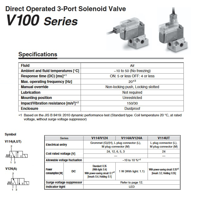 V100, Elektromagnetický přímo ovládaný 3/2 ventil, standardní provedení.Mimořádně kompaktní přímo ovládaný ventil - samostatná nebo vícenásobná připojovací deska.Řešeno v kódu U: světelná signalizace, zhášecí obvod, nepolární typ. Z: světelná signalizace, zhášecí obvod.Volitelné: 2: normálně otevřený "N.O." nebo 1: normálně zavřený N.C., vysoký průtok: 17 l/min (ANR).Se základní deskou (velikost připojovacího závitu M5) nebo bez desky. Elektrické připojení: H: elektrické připojení: vodiči, délka kabelu 600mm (např. kód se základní deskou, 5= 24V/DC, normálně zavřený: V114-5HU-M5).Pomocné ruční ovládání: tlačítko bez aretace, např. V114-5LOU-M5. LO: připojení konektorem typu L, bez konektoru.
