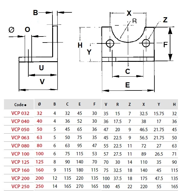 VCP125; DN (mm) 125, Hmotnost (kg) 2,368, Určeno na hadici [mm] pro válec 125, Kóta A 90