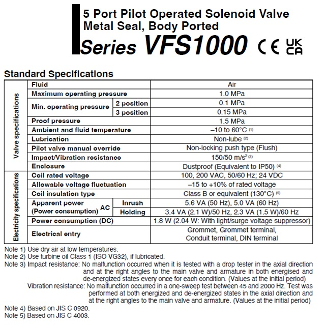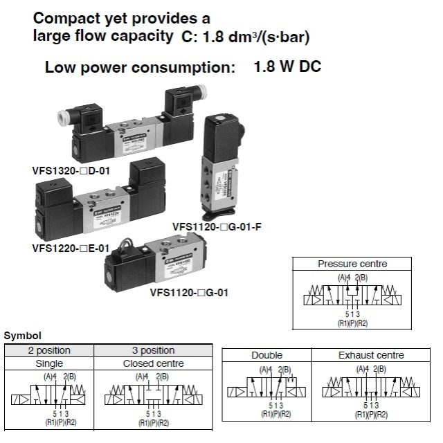 Řadu ventilů VFS s ocelovým těsněním šoupátka je možné použít samostatně nebo v provedení do bloku s interním prodrátováním či individuálním elektrickým připojením. VFS1000, Elektromagnetický nepřímo ovládaný 5/2, 5/3 ventil, se závity v tělese (metrický).Funkce: "1"- 5/2 monostabilní, "2"- 5/2 bistabilní, "3"-5/3 středem ventil N.C., "4" - 5/3 ventil středem odvzdušněná N.O., "5"- 5/3 ventil středem zavzdušněná."F" na konci kódu jsou motážní padky.