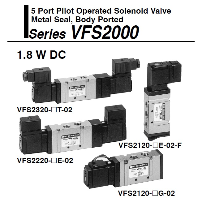 Řadu ventilů VFS s ocelovým těsněním šoupátka je možné použít samostatně nebo v provedení do bloku s interním prodrátováním či individuálním elektrickým připojením. VFS2000, Elektromagnetický nepřímo ovládaný 5/2, 5/3 ventil, se závity v tělese (metrický).Funkce: "1"- 5/2 monostabilní, "2"- 5/2 bistabilní, "3"-5/3 středem ventil N.C., "4" - 5/3 ventil středem odvzdušněná N.O., "5"- 5/3 ventil středem zavzdušněná."F" na konci kódu jsou motážní padky.