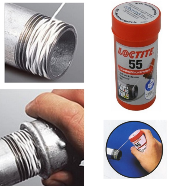 LOCTITE® 55™, je závitové těsnění pro plyny, vodu nebo oleje, jež se aplikuje ve formě šňůry přímo na závity.Doporučuje se pro těsnění kuželových i válcových závitů u kovových nebo plastových trubek až do velikosti 4" (palců).Odolává plynům, LPG, svítiplynu, zemnímu plynu, propan-butanu, kondenzátům plynu, stlačenému vzduchu, oleji a mnoha kapalinám. Umožňuje trvalý styk s pitnou vodou - viz normy a schválení DVGW, KTW, NSF, GAS. Též i schválený způsob utěsnění rozvodů pitné horké vody.Nahrazuje vlastnostmi jak konopí, plastová, PTFE nebo jiná těsnění.Použití: Instalatéři, montéři, řemeslníci, výrobci produktů se závity atd.Návod na použití a postup: Před nanesením produktu očistěte součásti drátěným kartáčem.Začněte navíjet s předpětím ve směru stoupání závitu a přidržte si konec šňůry přibližně dvě otáčky od konce závitu.Navíjejte vlákno ve směru stoupání závitu od konce trubky. Pro optimální funkci by měl být závit vyplněn, aniž by byly zcela překryty hrany závitů. Poznámka: Není nutné vyplnit všechen závitový prostor.Neaplikujte zbytečně mnoho těsnícího vlákna. Přebytečný materiál má při montáži potrubních dílů tendenci být vytlačován a je tak mechanicky mnohem obtížnější závit dotáhnout.Uřízněte vlákno nožíkem na vnitřním víčku obalu, přitlačte a uhlaďte volný konec na povrch závitu.Závit těsněný produktem LOCTITE® 55™ může být pootočen zpět až o 90° po dotažení.