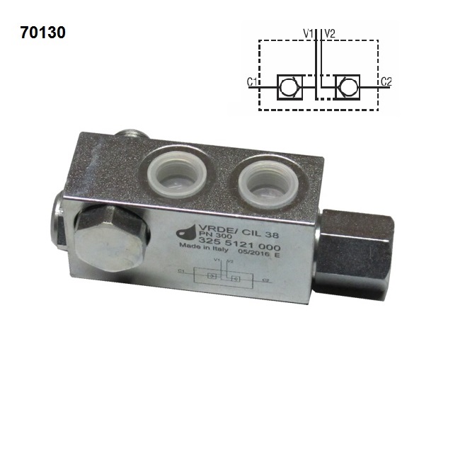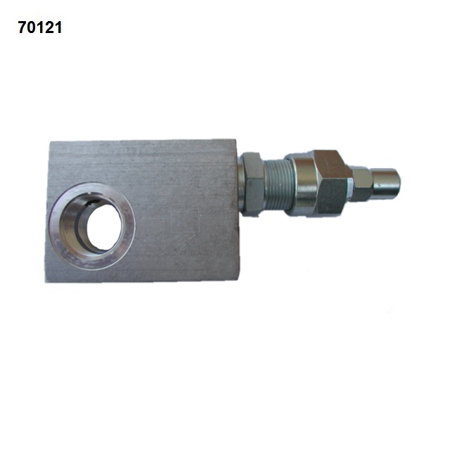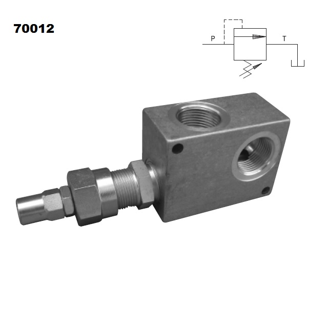 Tento ventil je přímo řízený.Montáž: Vstup "P" je připojen k tlakové větvi. Druhý odvor je připojen do odpadní větvě, zpravidla k nádrži.Funkce: Pokud je tlak ve větvi ke stupu P větší než je tlak nastavený pružinou, ventil se otevře a přepustí se nabytečný tlakový olej do odpadní větve, čímž se sníží tlak v tlakové větvi.Nastavení: Povolte jistící matici a zašroubujte šroub pro přidání tlaku. Ke snížení pojistného tlaku se naopak šroub povoluje.