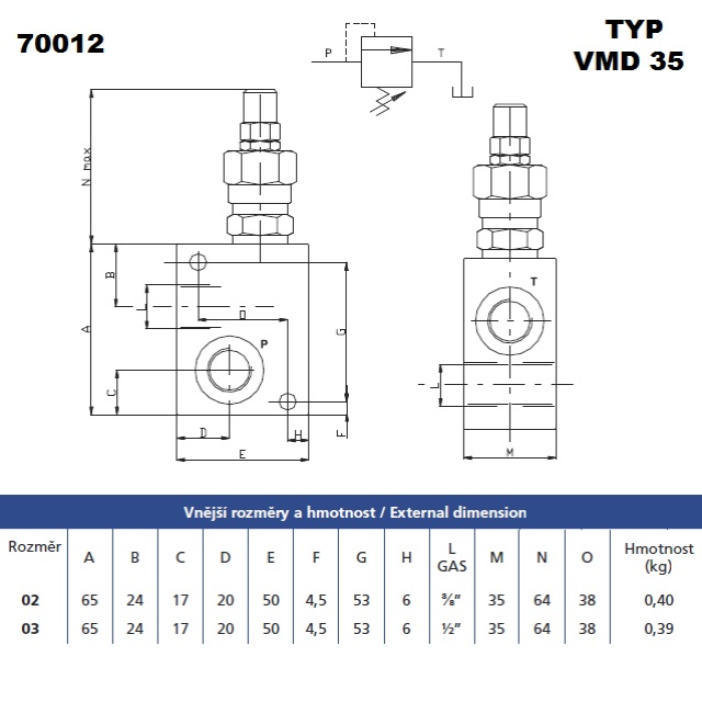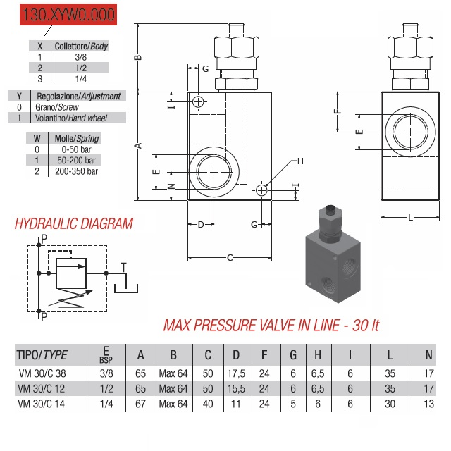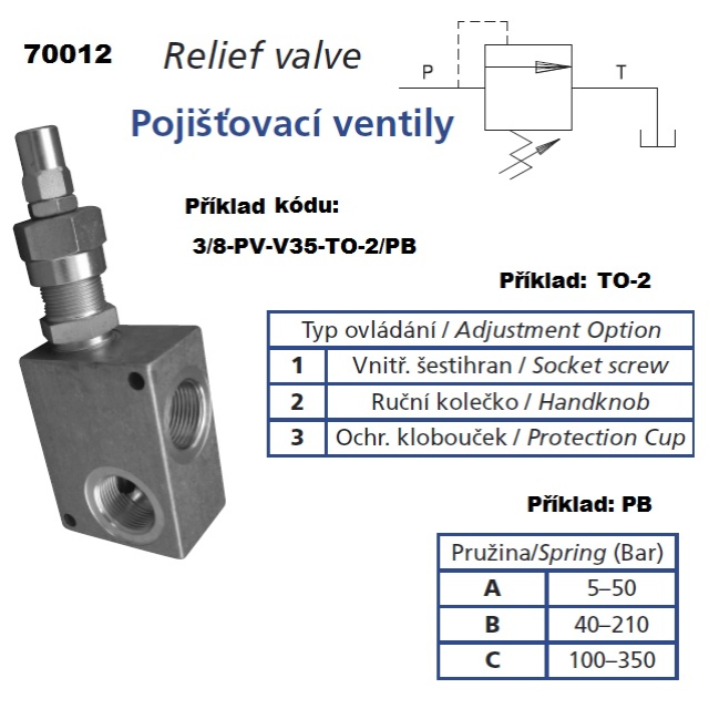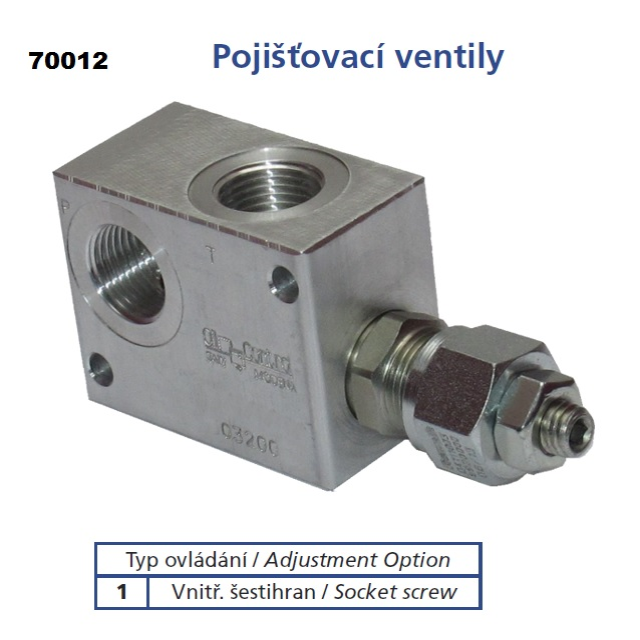 Pojišťovací tlakový ventil slouží k ochraně hydraulického systému před přetížením.Tento ventil je přímo řízený. Max. průtok 30 l/min. (35 l/min. max.)Montáž: Vstup "P" je připojen k tlakové větvi. Druhý odvor je připojen do odpadní větvě, zpravidla k nádrži.Funkce: Pokud je tlak ve větvi ke stupu P větší než je tlak nastavený pružinou, ventil se otevře a přepustí se nabytečný tlakový olej do odpadní větve, čímž se sníží tlak v tlakové větvi.Nastavení: Povolte jistící matici a zašroubujte šroub pro přidání tlaku. Ke snížení pojistného tlaku se naopak šroub povoluje.
