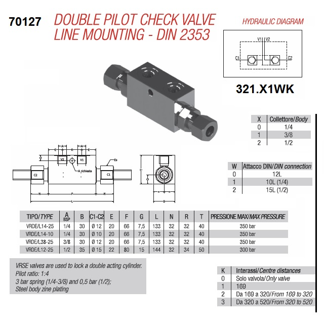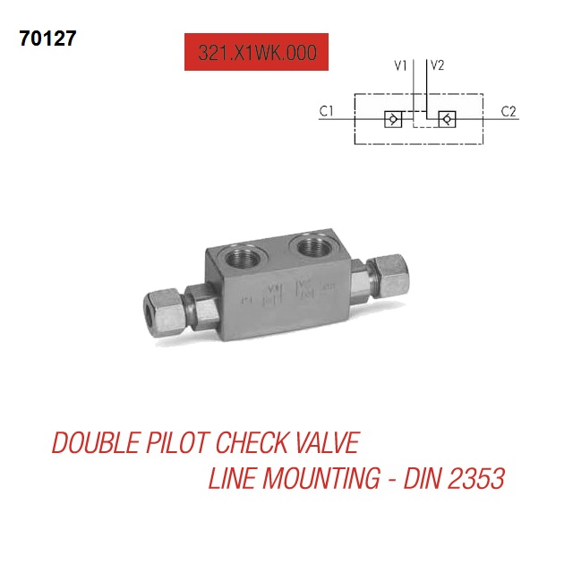 Pilotní poměr 1 : 4.3 barová pružina je nastavena u vstupu 1/4" a 3/8", pro vtupy 1/2" pak 0,5 bar.Funkce a použití: Tyto hydraulické ventily (zámky) se používají pro uzavření průtoku (zastavení spotřebiče v poloze), v obou směrech.Ventil je vždy průtočný v jednom směru a zablokovaný v druhém směru, dokud není odblokován přivedením pilotního (ovládacího) tlaku.
