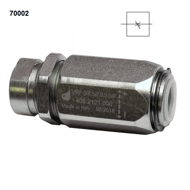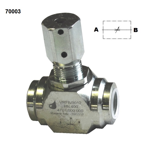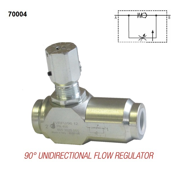 Použití: škrcení průtoku vysokotlakového oleje jedním směrem (z A do bodu B), volný průkok opačném směru (B>A).Umístění a ovládání: Tento obtokový ventil bývá uchycen na panelu stroje nebo ve stacionárním místě. Ručně, kolečkem se nastaví rychlost plnění, aretace (zajištění) pak zapuštěným šroubkem v plastovém kolečku. Otevírací tlak ventilu je 0,5 Bar.