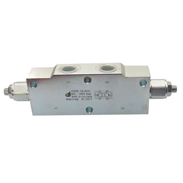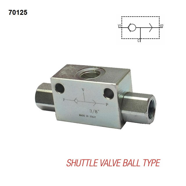 Funkce: Kulička ventilu se automaticky přesune dle vyššího tlaku z jedné strany P na druhou, do výstupu ozn. "V" vždy proudí médium z jedné strany (např. pro rozdílné rychlosti výsuvu pístnice nebo pro automatickou volbu vyššího tlaku větve).
