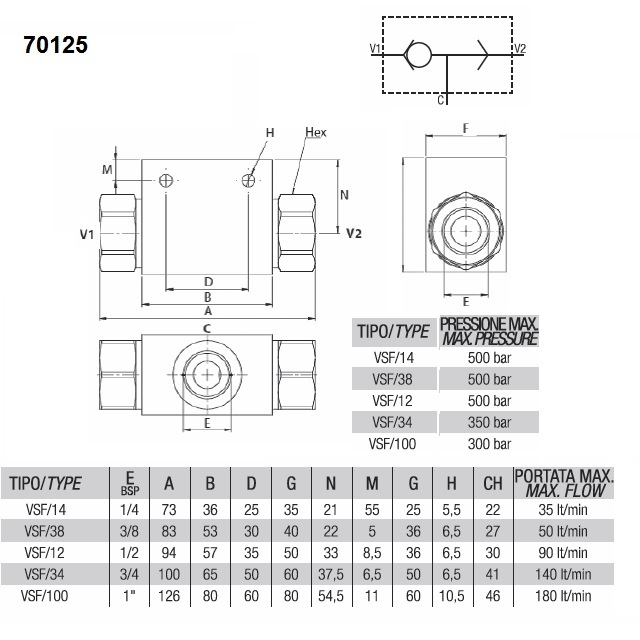 Varianty335.1000.000; Provozní tlak (bar) 500, Vnitřní závit 3x 1/4, Ventil Kulička, Hmotnost (kg) 0,6, Šestihran 22, Kóta A 73, Typ 35 l/min.