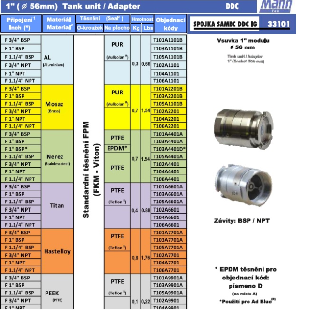 Závitové těsnění je také v tabulce jako rozlišovací parametr...např. EPDM je vhodné pro kapalná aditiva Ad Blue. Spojka modulového profilu 1" má vsuvky o průměr 56 mm, s těmito vnitřní závity:BSP/NPT 3/4", 1" nebo 1.1/4" (jak u této vsuvky, tak i u rychlospojky). Hlavice je vždy otočná o 360° vůči protilehlé spojce. Průtok média je možný teprve až po spojení rychlospojky se vsuvkou a pootočení vpravo cca 100°. Rozpojování: Rychlospojka i vsuvka se musí nejprve pootočit vlevo, aby se rozpojily ventily.Na konci kódů artiklů je uvedeno vnitřní těsnění spojek, závitová jsou volitelná, ale ve výbavě jsou dodávany takto: M-DDC-T103IG/AL-56-BSP-VU - (+závitové PUR), M-DDC-T103IG/SS-56-BSP-PTFE - (+závitové PTFE), M-DDC-T103IG/SS-56-BSP-EPDM - (+závitové EPDM).