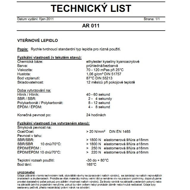 Rychle tvrdnoucí standardní typ lepidla pro obecnou aplikaci. Vhodné pro většinu materiálů, u nichž nejsou spojeny kladené extrémní požadavky např. pryže SBR, NBR, EPDM.Návod: Lepené plochy dobře očistěte a odmastěte. Dávkovači špičkou naneste na jednu stranu tenkou vrstvu lepidla. lepené díly lehkým tlakem přitlačte k sobě a za několik sekund zafixujte. Po upotřebeni dózu dobře uzavřete.