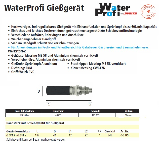 GGHS; Celková délka (mm) 182, Provozní tlak (bar) 16, Rozměr nebo typ závitu G 3/4“ f, Délka trnu (mm) 12, O-kroužek FKM, Hmotnost (kg) 0,348