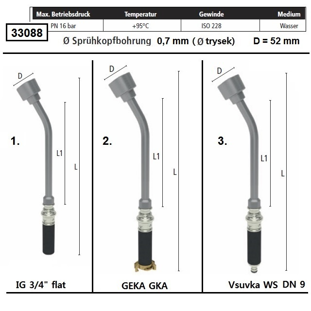VariantyGG40520734I; Celková délka (mm) 600, Provozní tlak (bar) 16, Rozměr nátrubku (mm) tryska 0,7 mm, Vnitřní závit G 3/4", Série D=52, Délka nátrubku (mm) 400, Hmotnost (kg) 1,5