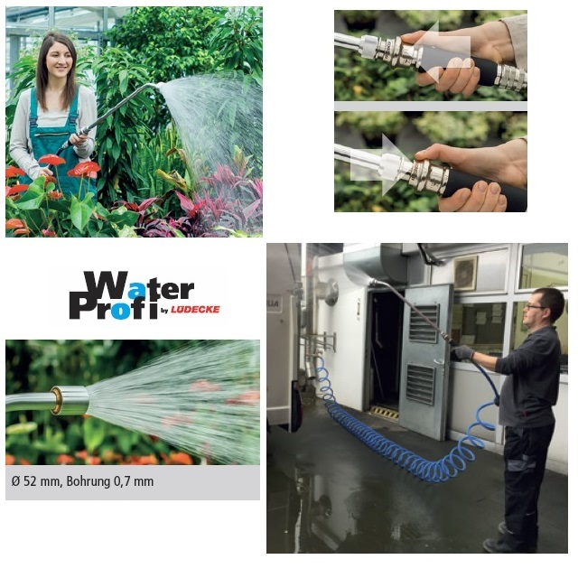 Výrobky Water Profi DN 9 jsou patentem výrobce Lüdecke, jsou určeny především pro průmyslové použití.Všechny tři verze (tohoto artiklu) mají připojení vrchního konce "D" o průměru 52 mm, trysky o průměrech 0,7 mm.Možnosti spodního hadicového připojení uvádí tabulka ve sloupci "Připojovací závit".a) varianta s vnitřním závitem IG 3/4" (flat)b) varianta, kde místě závitu je našroubována GEKA typ GKAc) rychlospojková vsuvka DN 9 s čepem o vnějším průměru 17 mm
